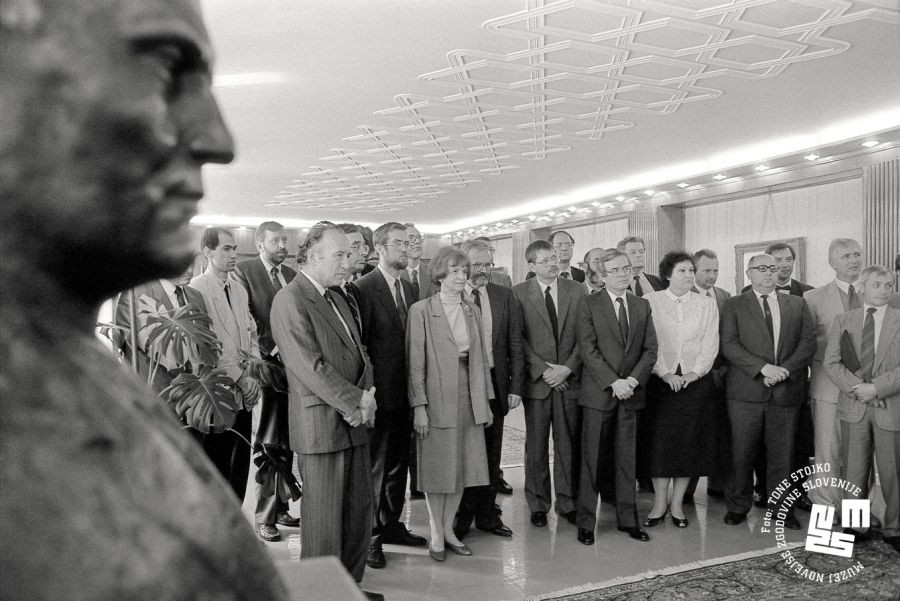 Znotraj koalicije Demos, ki je dosegla osamosvojitev, so se začela poglabljati nasprotja. | Avtor Tone Stojko, hrani: Muzej novejše zgodovine Slovenije