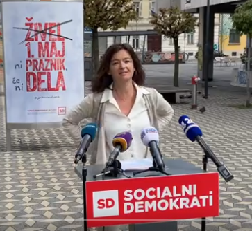 Tanja Fajon, predsednica SD, pred mikrofoni in kamerami, v tipični diktatorski drži