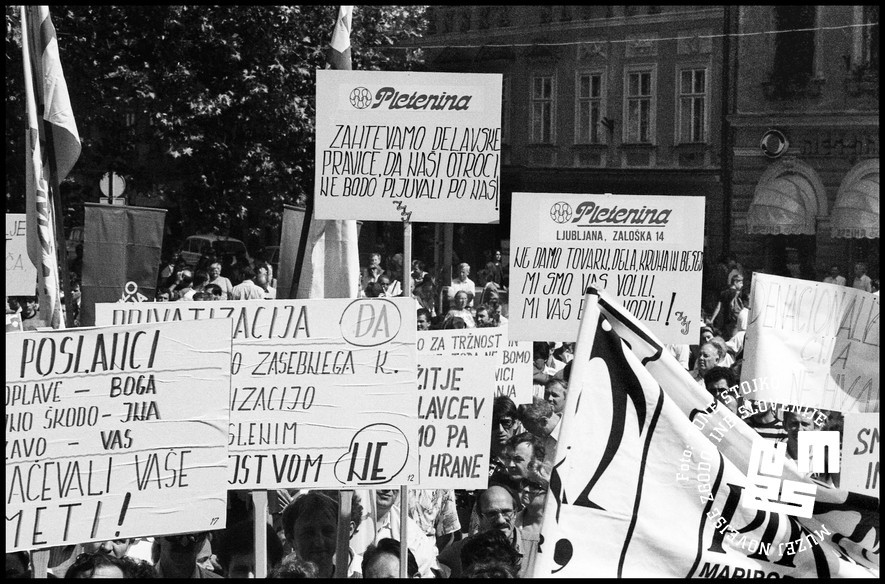 Zveza svobodnih sindikatov Slovenije je v Ljubljani organizirala demonstracije proti lastninskim zakonom, ki jih je predlagala vlada. | Avtor Tone Stojko, hrani: Muzej novejše zgodovine Slovenije