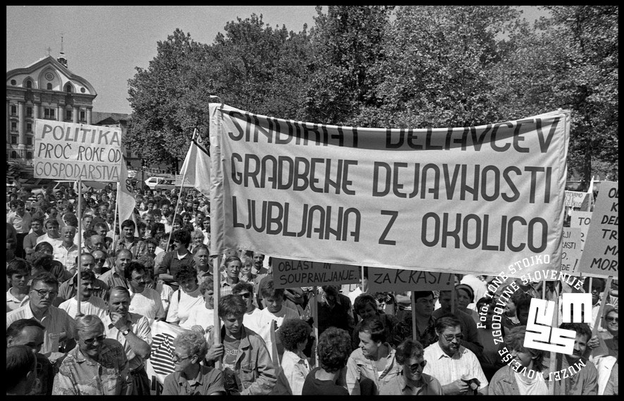 Zveza svobodnih sindikatov Slovenije je z demonstracijami izvajala politični pritisk na vlado. | Avtor Tone Stojko, hrani: Muzej novejše zgodovine Slovenije