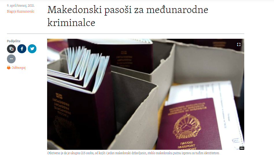Naslovnica medija Slobodna Evropa, ki razkriva kriminalne posle o ponarejanju potnih listov v Severni Makedoniji. (Foto: Posnetek zaslona- Slobodna Evropa)