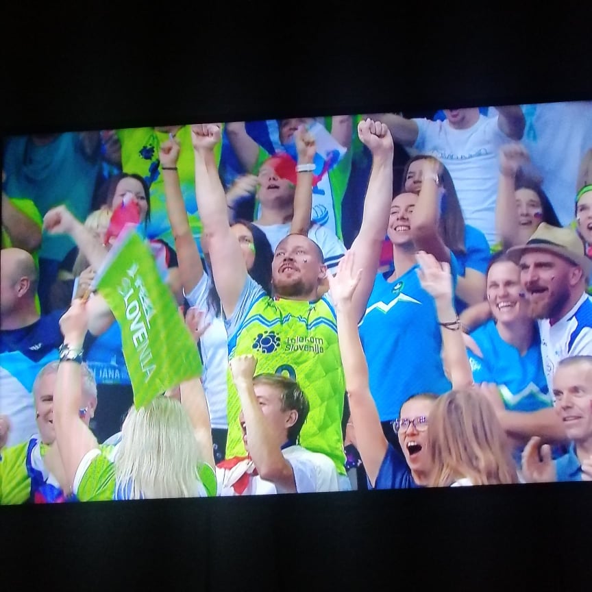 Slovenski navijači navdušeno navijajo za slovenske odbojkarje. (Foto: Posnetek zaslona-Kanal A)