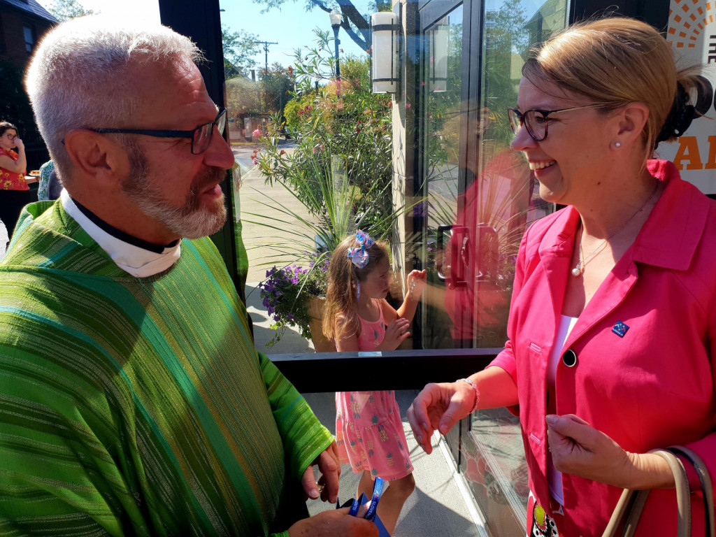Ministrica in novi župnik John Retar, ki je slovenskega rodu in je nadomestil dolgoletnega župnika Jožeta Božnarja