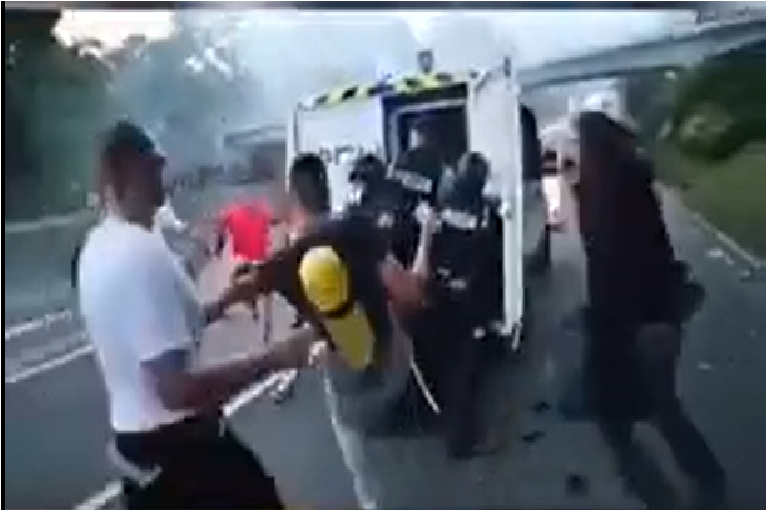 Fizično nasilje protestnikov nad policisti. (Foto: Posnetek zaslona- Demokracija, Youtube, David Volk Tik tok)