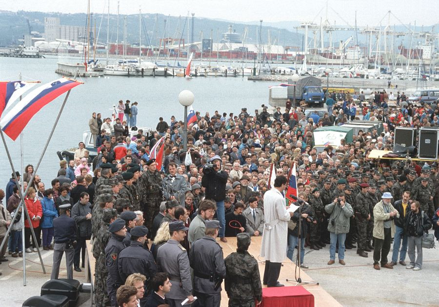 Slovesnost v Kopru ob odhodu zadnjega vojaka jugoslovanske armade. | Avtor Vojaški muzej Slovenske vojske