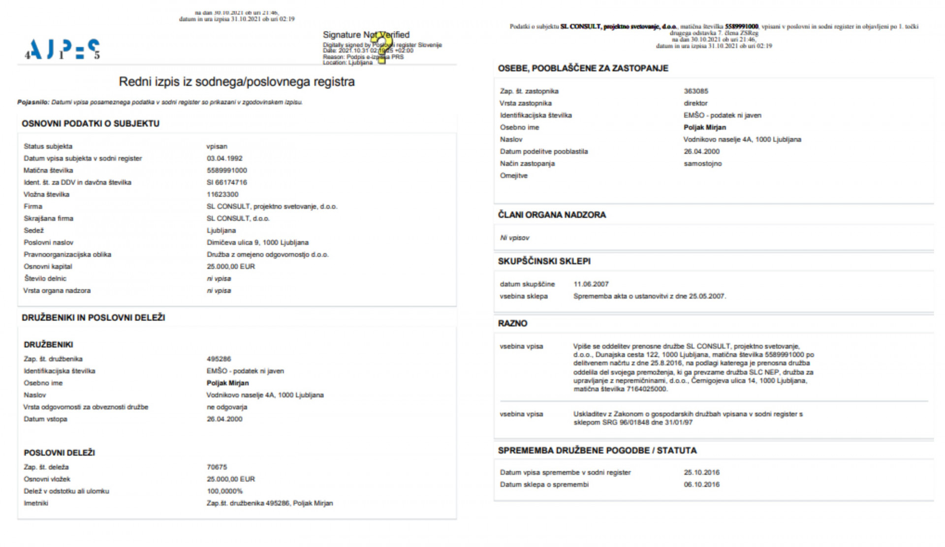 Izpis iz sodnega registra, kjer je razvidno, da je Mirjan Poljak edini lastnik podjetja SL-Consulting. (Foto: Posnetek zaslona- Ajpes)