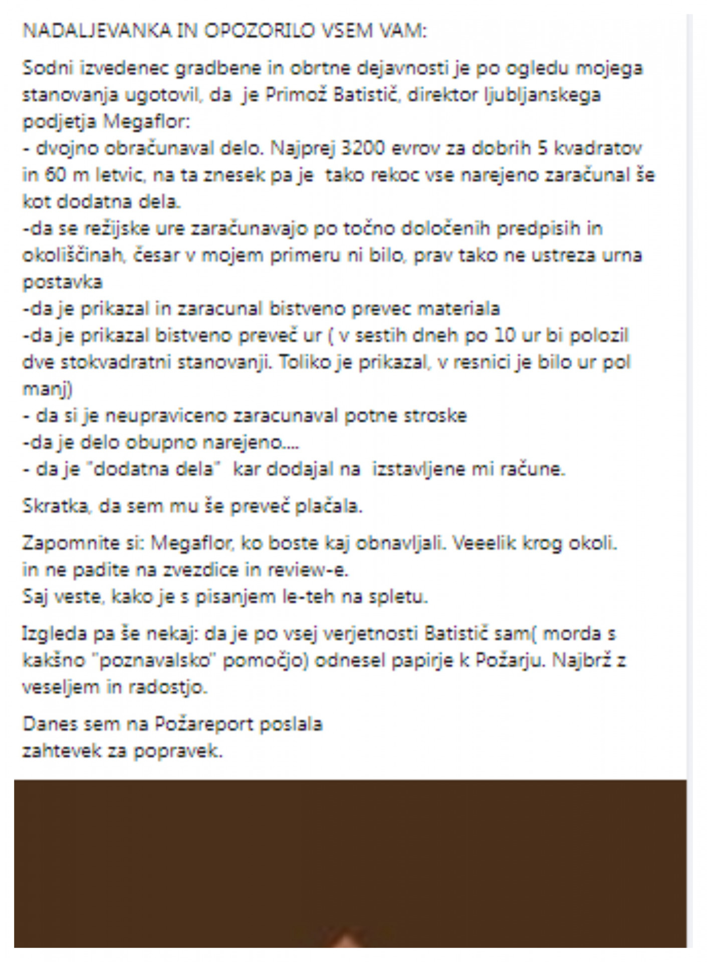 Zapis Eugenije Carl na svojem profilu na Facebooku o podjetju Megaflor. (Foto: Posnetek zaslona- Facebook)