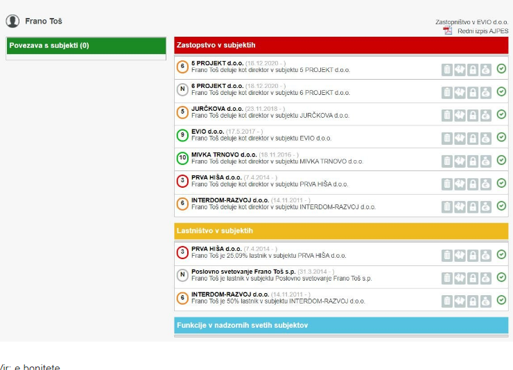 Lastniški deleži Frana Toša v njegovih podjetij. (Foto: E-bonitete)