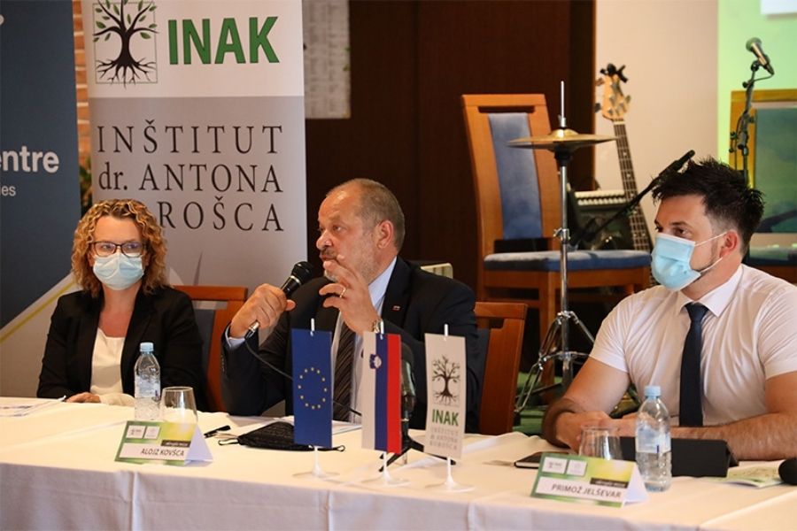 Posvet Demografske spremembe v Sloveniji in Evropi, Ankaran, 30. avgust 2020. Državna sekretarka Monika Kirbiš Rojs, predsednik DS RS Alojz Kovšca, direktor Inštituta dr. Antona Korošca Primož Jelševar. Vir slike: DS RS.
