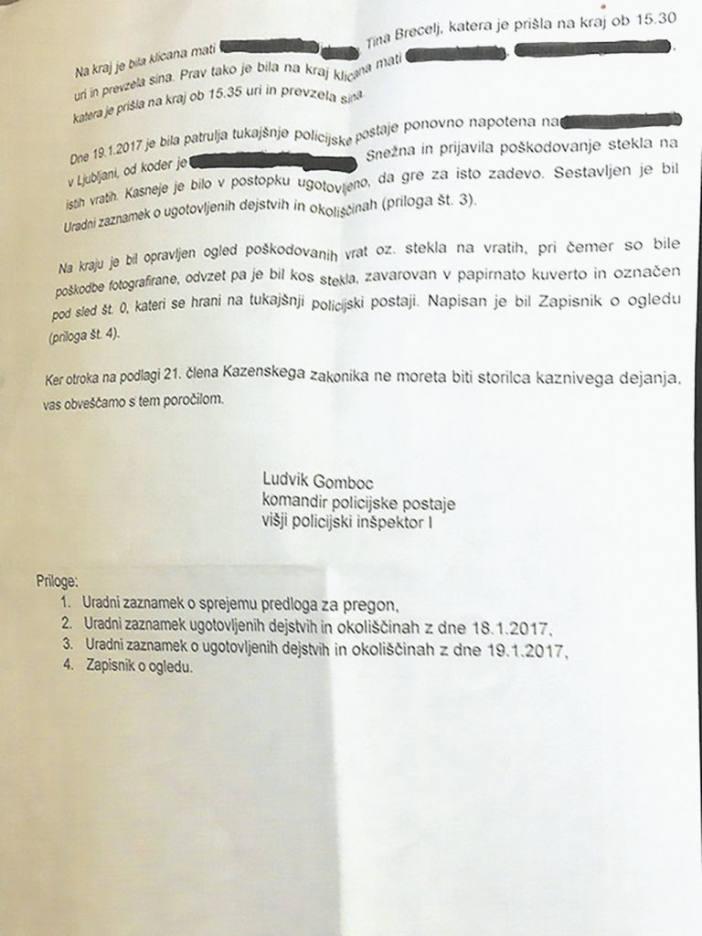 Kopija policijskega zapisnika, kjer je vidno ime Tine Brecelj. (Foto: Posnetek zaslona- Škandal24)