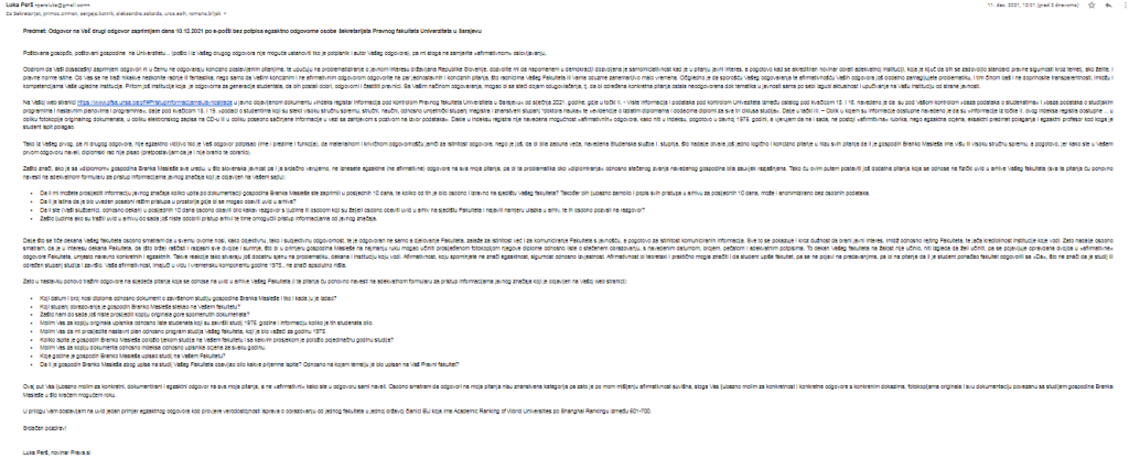 Vprašanja poslana PF Sarajevo. (Foto: E-mail Luka Perš)