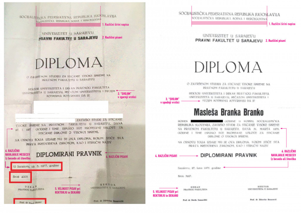 Razlike med kopijo overjene diplome diplomanta PF Sarejvo iz leta 1977 in Masleševo kopijo diplome iz leta 1975, ki jo je predstavilo Vrhovno sodišče RS. (Foto: Bralec #Prava)