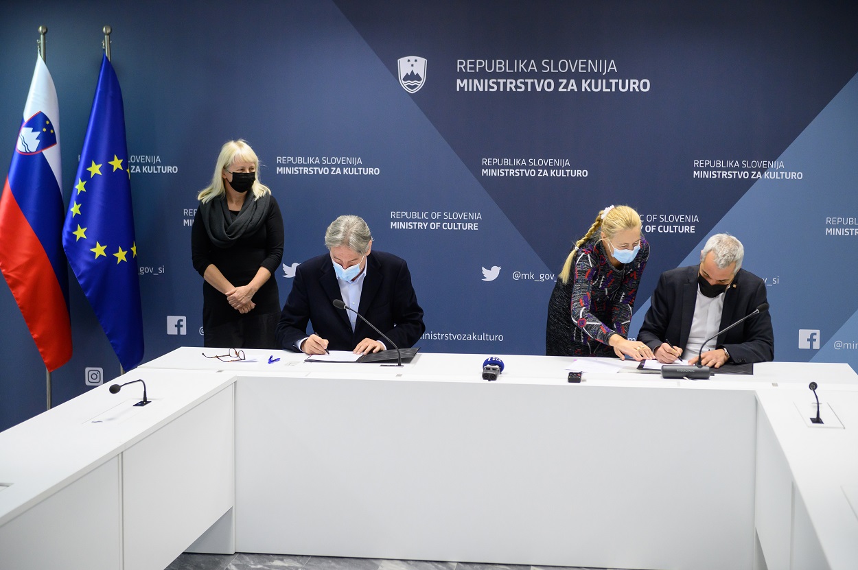 Minister za kulturo dr. Vasko Simoniti in župan Mestne občine Maribor Aleksander Saša Arsenovič ob podpisu pogodbe o sofinanciranju projekta Center Rotovž | Avtor Nebojša Tejić/STA