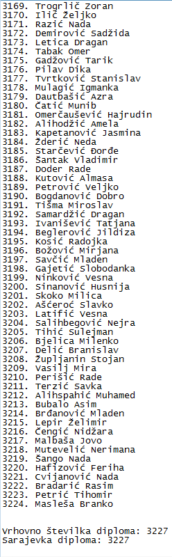 Vsako ime smo si zapisali posebej. Po večkratnem štetju smo prišli do številke 3224. Zakaj na diplomah PF Sarajevo in VS RS piše številka Masleševe diplome 3227?