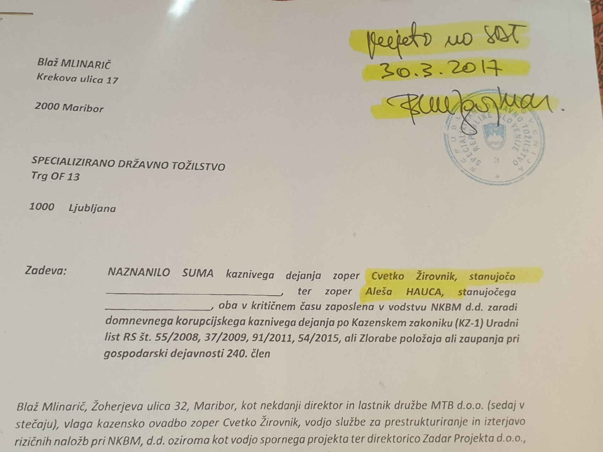 Kazenska ovadba Blaža Mlinariča Specializiranemu državnemu tožilstvu zoper Cveto Žirovnik in Aleša Hauca je SDT Blanka Žgajner zavrnila kot neutemeljeno