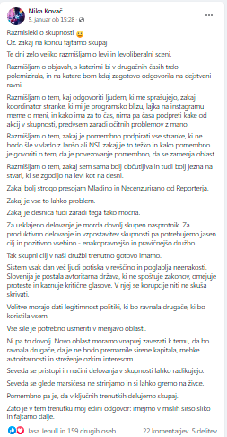 Zapis Nike Kovač, kjer se delno kritično loti Luko Mesca zaradi všečka Mesca na Instagramu o njenem "memeju".(Foto: Facebook)