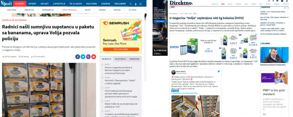 Črnogorski mediji razkrivajo, da so našli 400 kilogramov kokaina v škatlah banan podjetja Derby v lasti Izeta Rastoderja. (Foto: Posnetek zaslona- Vijesti in Direktno)