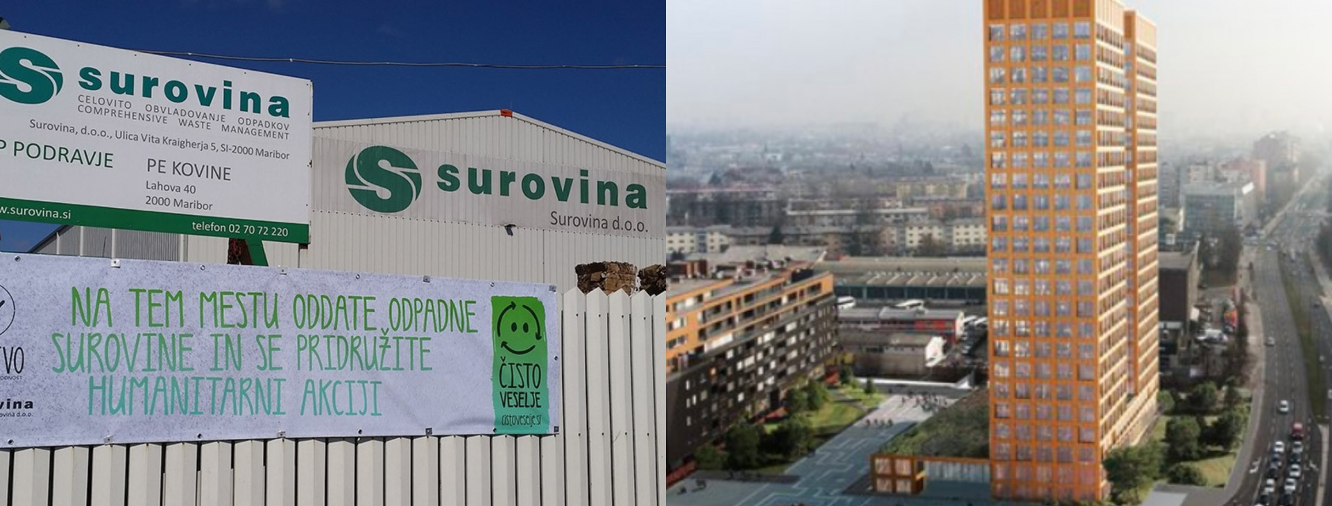 Surovina je eno največjih podjetij, ki se ukvarja s predelavo odpadkov. Na desni strani maketa Rastoderjeve stolpnice v Šiški. (Foto: Posnetek zaslona- Surovina in Delo)