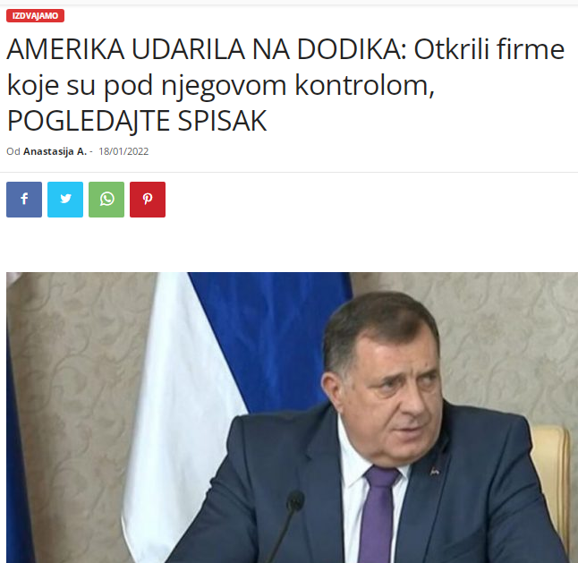 Naslovnica medija Vijesti Srpske o seznamu 65 podjetij, ki so se znašli na črnem seznamu oblasti v ZDA. (Foto: Posnetek zaslona- Vijesti Srpske)