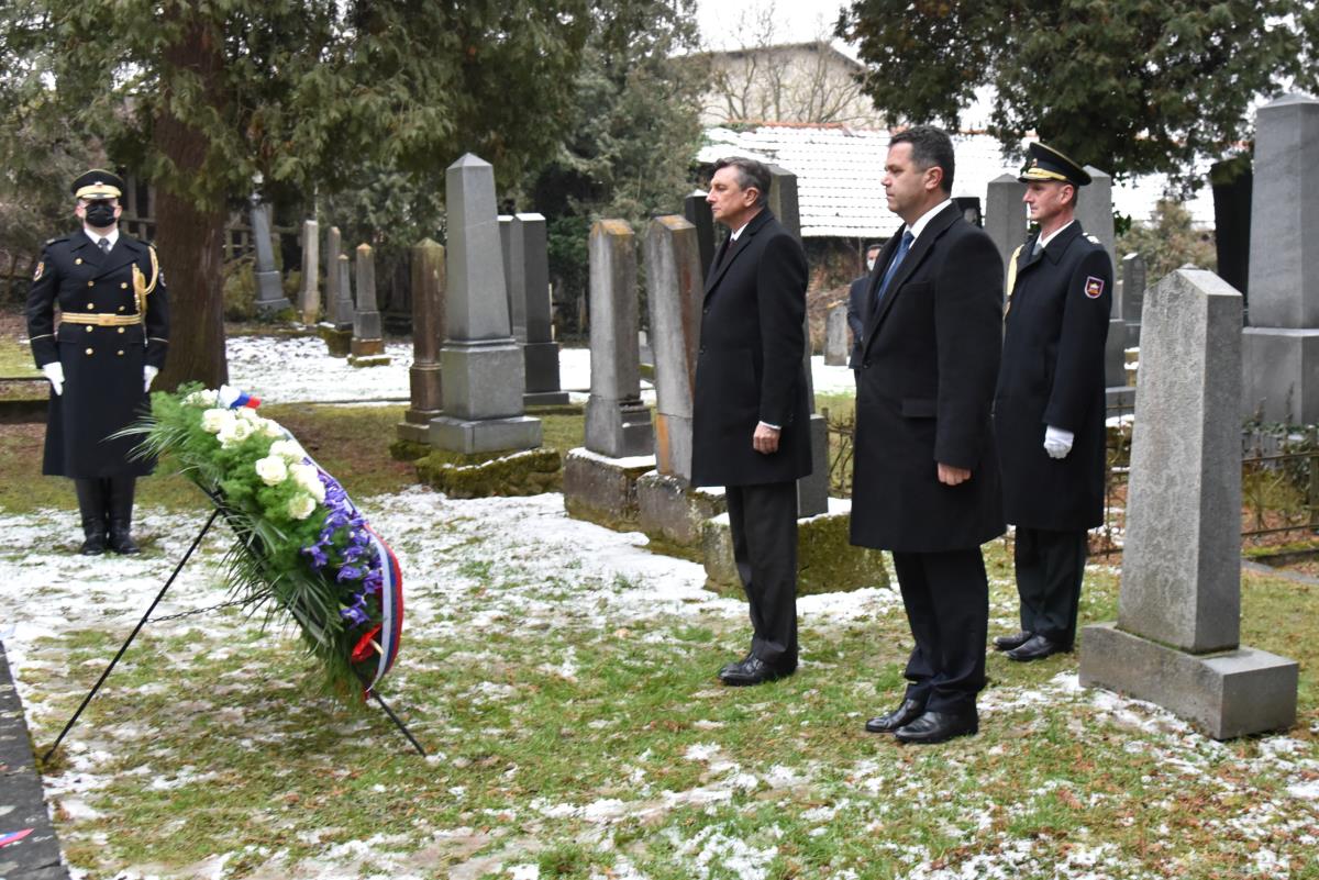 Na predvečer mednarodnega dneva spomina na žrtve holokavsta so se na judovskem pokopališču v Dolgi vasi žrtvam nacifašističnega nasilja poklonil predsednik Republike Slovenije Borut Pahor, direktor Centra judovske kulturne dediščine Sinagoga Maribor Boris Hajdinjak in župan Občine Lendava Janez Magyar. Zaradi trenutne situacije venca danes ni mogel osebno položiti veleposlanik Države Izrael. Foto Tomaž Galič