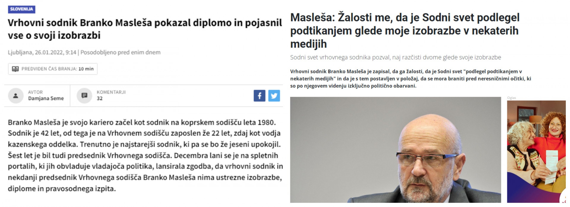 Naslovnici medijev 24ur in MMC RTV Slovenija, katerim je Masleša pokazal originalno diplomo in pravosodni izpit. Zakaj tega ni pokazal medijem, ki že skoraj dva meseca se ukvarjajo z odgovorom, ali je strokovna izobrazba za opravljanje sodnika v Sloveniji ustrezna. (Foto: Posnetek zaslona- 24ur, MMC RTV Slovenija)