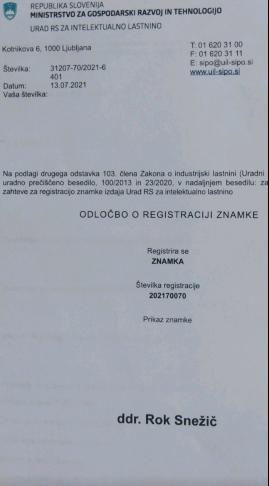 Odločba Ministrstva za gospodarstvo, tehnologijo in razvoj da je ddr. Rok Snežič blagovna znamka.