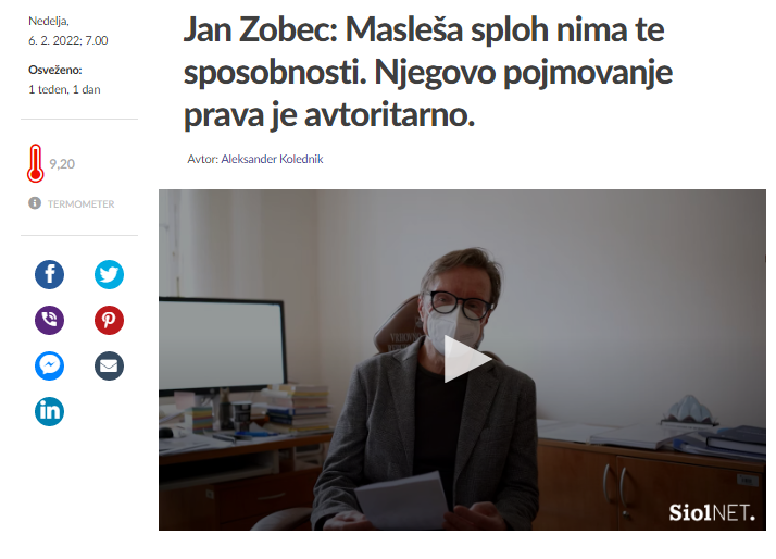 Vrhovni sodnik Jan Zobec se je v javnosti že večkrat kritično oglasil o spornosti pravosodnega izpita vrhovnega sodnika Branka Masleše. To je ujezilo tudi predsednika VS RS Florjančiča, da je javno povedal, da se VS RS ograjuje od njegovih izjav. (Foto: Posnetek zaslona- Siol)