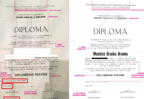 Primerjava kopij diplome med overjeno kopijo diplome diplomiranca PF Sarajevo iz leta 1977 in Masleševo kopijo diplome iz leta 1975 posredovano s strani VS RS. Enake razlike se opazijo tudi na originalni Masleševi diplomi in overjeno kopijo diplome iz leta 1977. (Foto: Bralec Prava)