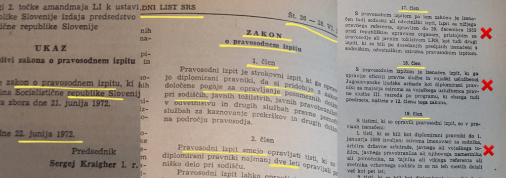 Ključni členi zakonodaje o pravosodnem izpitu iz leta 1972. (Foto: Prava)
