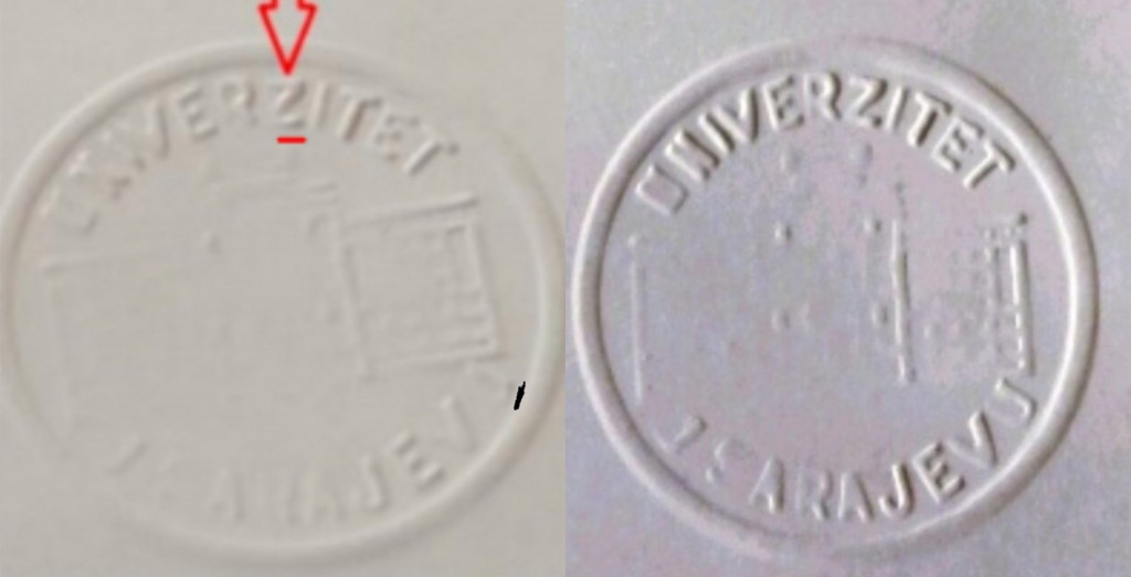 Na levi strani slepi žig na Masleševi diplomi, na desni strani podoba pravega žiga. Lahko jasno vidite, da se razlikuje črka Z in spodaj se jasno vidi črka U, na Masleševi diplomi pa črka O. (Foto: Prava, Twitter)