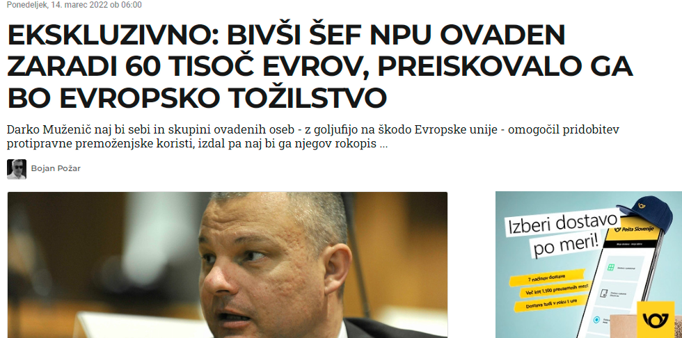 NaslovnicaPožareport, ki razkriva vloženo kazensko ovadbo proti DarkuMuženiču. (Foto: Posnetek zaslona-Pozareport)