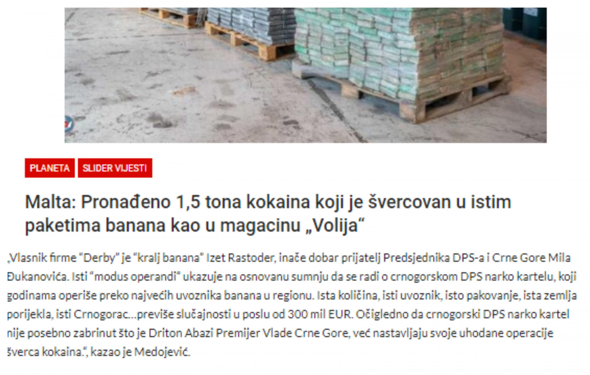 Izjava črngorskega politika Nebojšo Medojevića, da za pošiljko kokaina stoji narkokartel črnogorskega predsednika Mila Đukanovića in kralja banan Izeta Rastoderja. Lahko pa so spet "zlobne južnoameriške" tolpe le "podtaknile" količine kokaina, kot se ob zadnjih razkritih pošiljkah izgovorijo v podjetju Derby. (Foto: Posnetek zaslona-Borba)