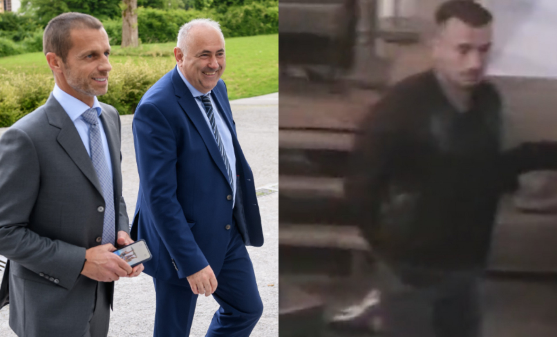 Aleksander Čeferin, Radenko Mijatović in aretirani Slavko Vinčič. (Foto: Posnetek zaslona- STA, Telegraf)