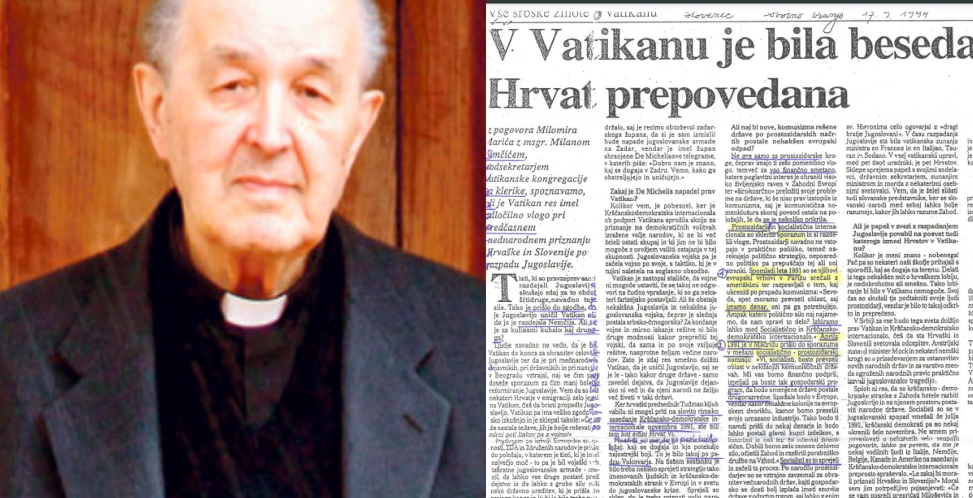 Msgr. Milan Simčić in objavljeni intervju v časopisu Slovenec z dne 17.9.1994. Naslednja številka Slovenca ni več izšla. (Foto: Posnetek zaslona- Jutranji list in bralec Prava.si)