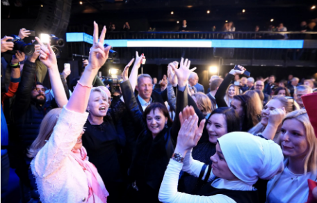 Veselje članov Gibanje Svobode ob razglasitvi zmage na aprilskih parlamentarnih volitvah,. (Foto: Posnetek zaslona- Publishwall, STA)