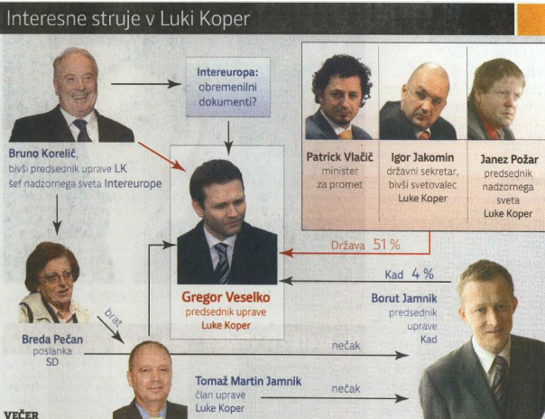 Povezave med Gregorjem Veselkom, Bruno Koreličem, poslovnim krogom Boruta Jamnika in takratnim ministrom za promet v Pahorjevi vladi Patrikom Vlačičem. (Foto: Posnetek zaslona-Večer)