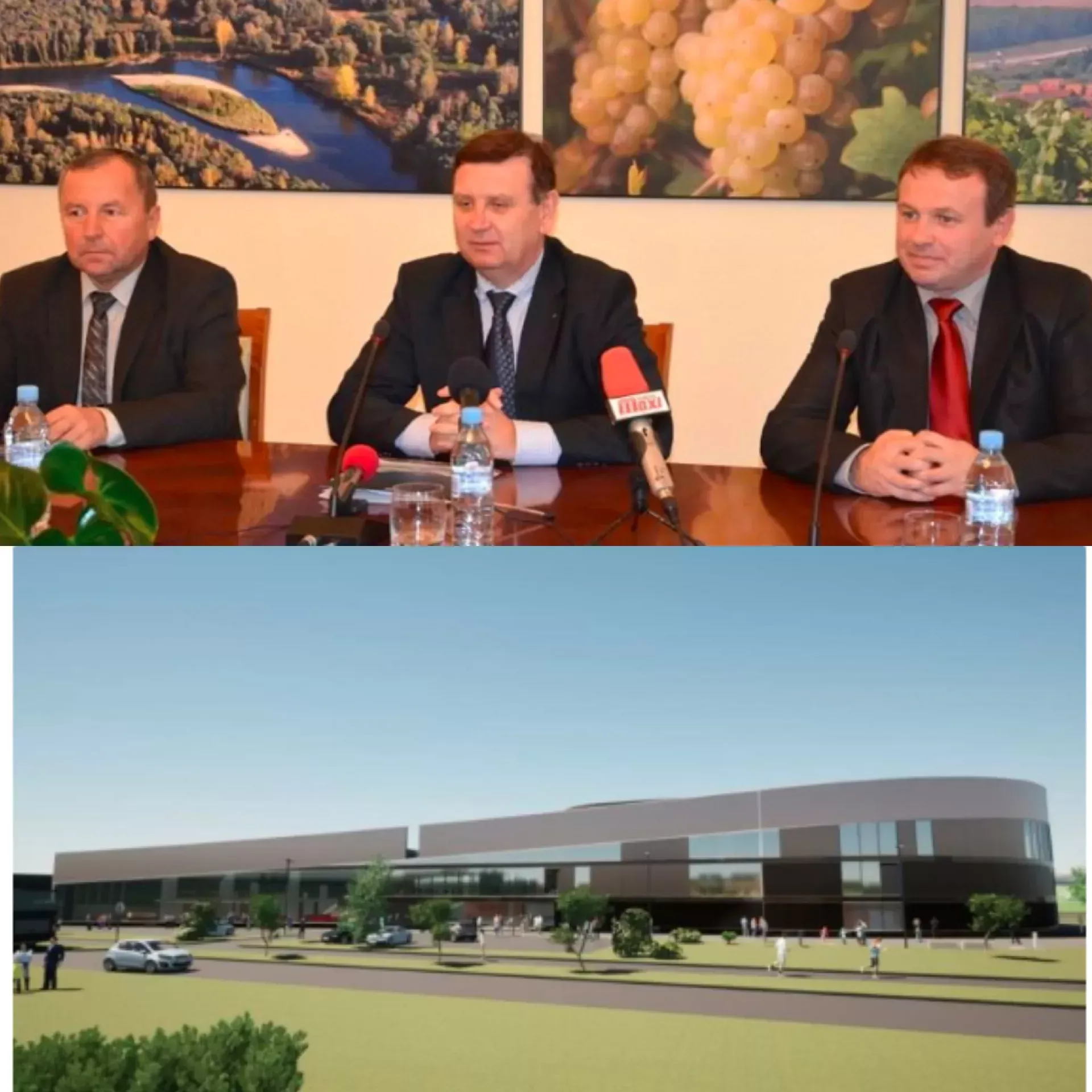 Stanislav Gjerkeš, Anton Balažek in Ferenc Horvat. Spodaj slika planirane večnamenske dvorane v Lendavi. (Foto: Posnetek zaslona-Pomurec in Občina Lendava, N1 Slovenija)