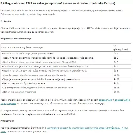 Navodila na spletni strani Adesa, kjer lahko vidite navodila za pravilno izpolnjevanje CMR tovornih listov. (Foto: Posnetek zaslona-Adesa)