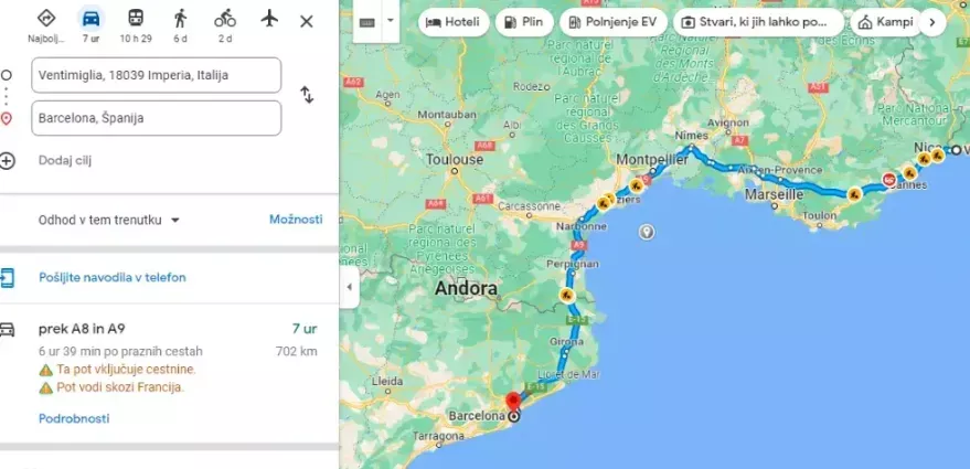 Razdalja med Barcelono in Ventamiglio. (Foto: Posnetek zaslona-Google maps)