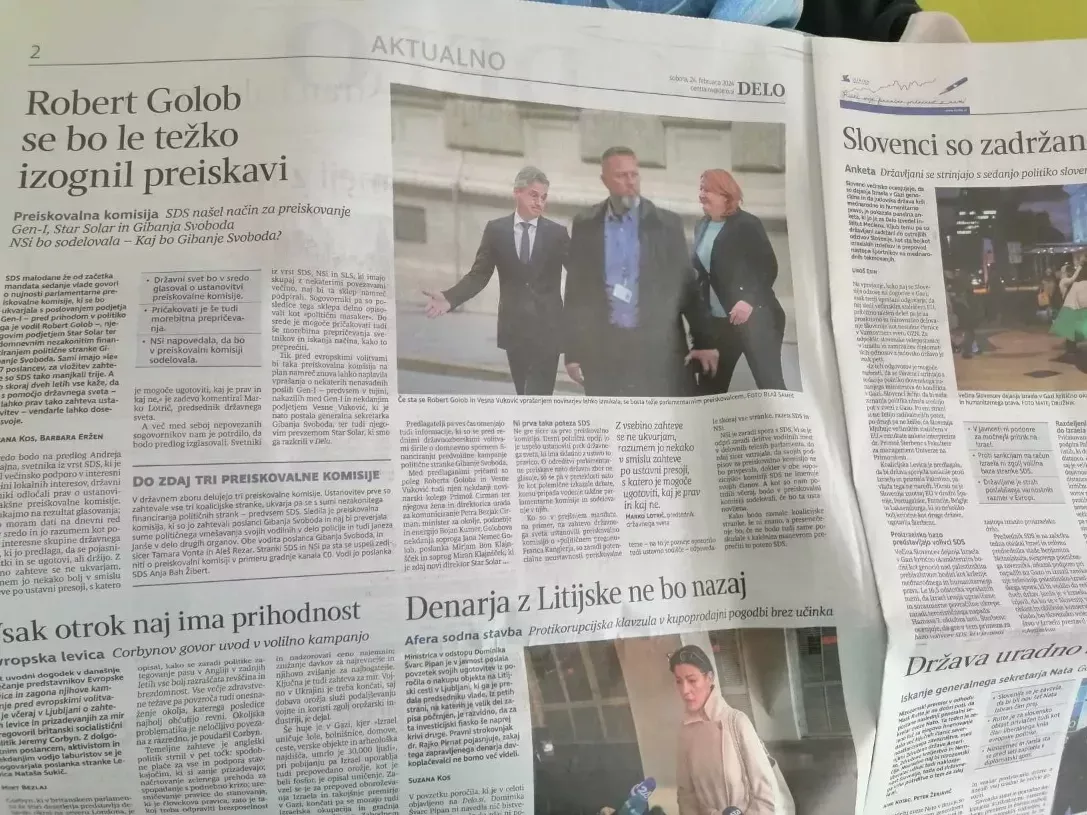 Članek v časopisu Delo, ki razkriva, da se bo ustanovila preiskovalna parlamentarna komisija o sumljivih poslih GEN-I. Omenjeno obdobje se bo nanašalo na čas, ko je temu podjetju predsedoval sedanji predsednik vlade dr. Robert Golob. (Foto: Luka Perš)