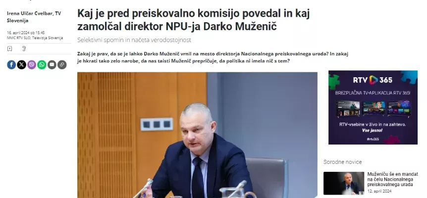 Omenjeni članek novinarke TV Slovenija Irene Ulčar Cvelbar je sprožil nove težave za sedanjega direktorja NPU Darka Muženiča. (Foto: Posnetek zaslona- MMC RTV SLO)