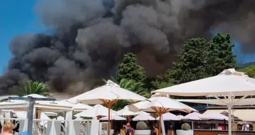 Slika dima iz gorečega objekta, kjer je imela svoje prostore lokal Alaya in drugi podjetniki. Zdaj jim zaradi požarja grozi poslovno uničenje, saj se je požar zgodil prav s pričetkom glavne turistične sezone v Portorožu. (Foto: Posnetek zaslona-Žurnal24)