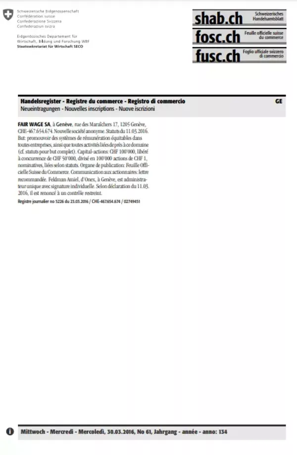 Uradni dokument ustanovitve podjetja švicarskega podjetja Fair Wage iz marca 2016. Njen prvi direktor družbe je postal švicarski odvetnik Feldman Amiel. (Foto: Posnetek zaslona-Moneyhouse)