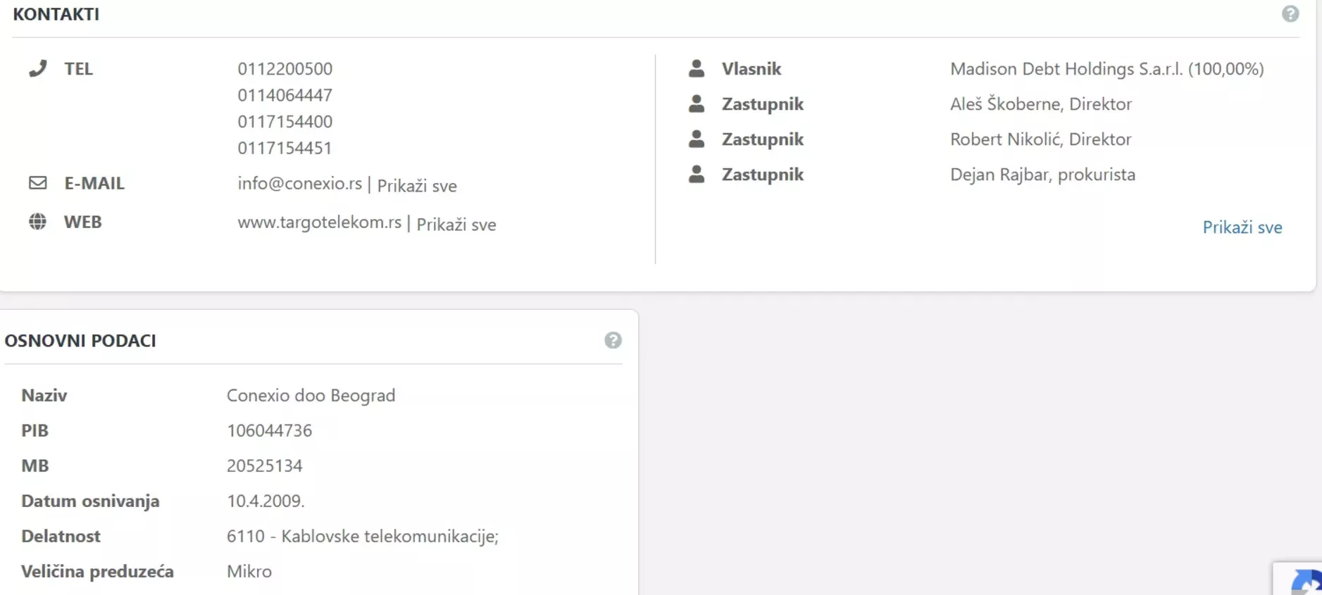 Kot direktorja srbskega podjetja Conexio sta zapisana Robert Nikolič in Aleš Škoberne. Prokurist družbe pa je Dejan Rajbar, skrbnik sklada York za področje Slovenije. (Foto: Posnetek zaslona-Companywall)