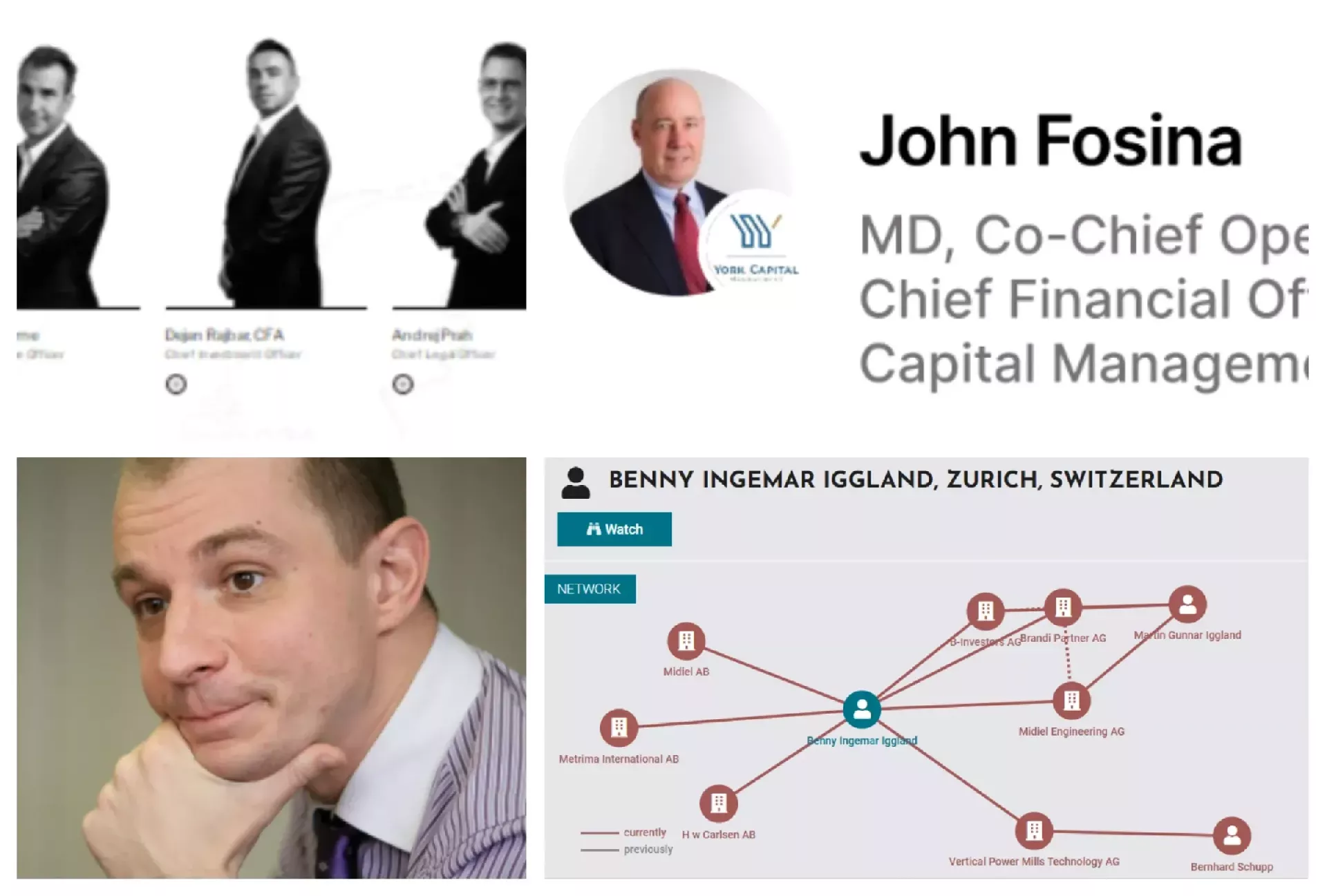 Aleš Škoberne, Dejan Rajbar in Andrej Prah. višji uslužbenec sklada York John Fosina, nekdanji varuh konkurence Jani Soršak in mreža podjetij švicarskega državljana Bennyja Ingemara Igglanda, največjega posamičnega lastnika paradržavne družbe Stelkom. (Foto: Posnetek zaslona- ECM Partnerji, Google)