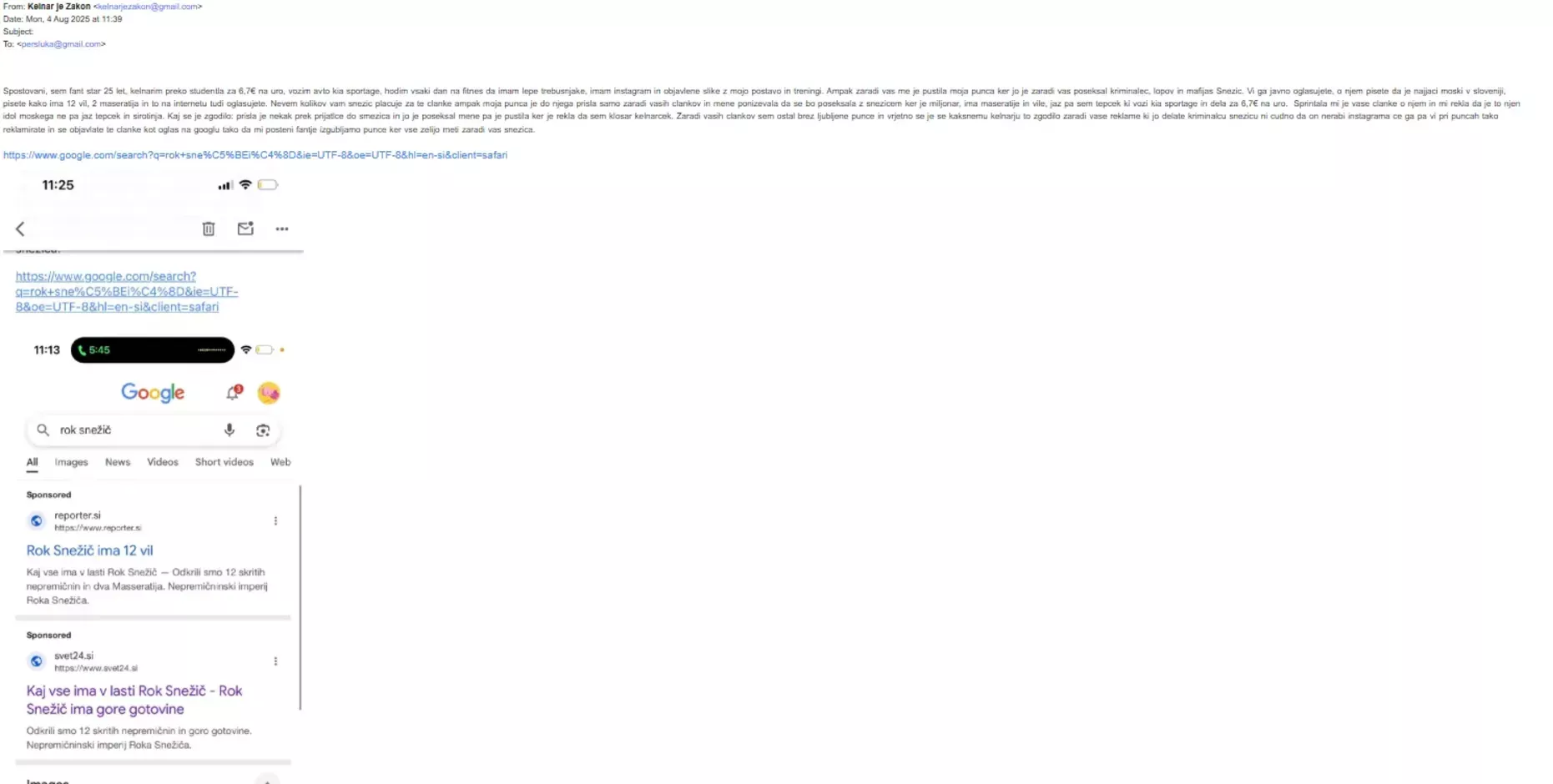 Elektronsko sporočilo razočaranega fanta, ki je izgubil punco po njegovem mišljenju zaradi objavljenih člankov o ddr. Roku Snežiču v nekaterih slovenskih medijih. (Foto: Luka Perš)