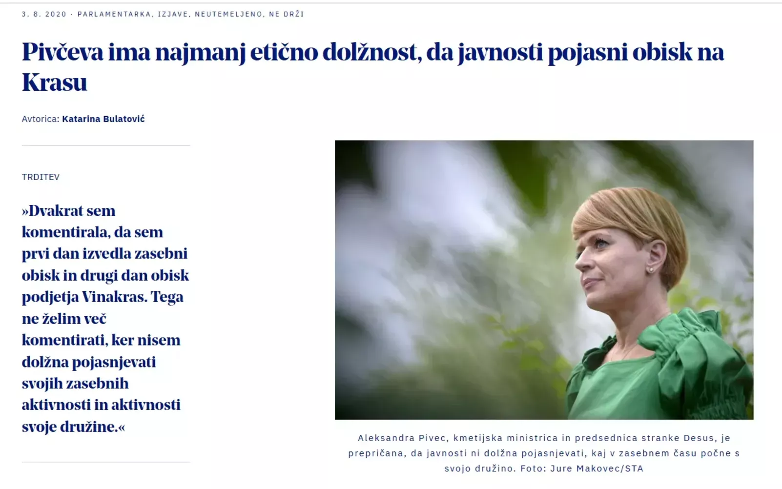 Ena izmed zgodb iz zadnje Janševe vlade, ko je nekdanja ministrica za kmetijstvo Aleksandra Pivec zaradi "šnite pršuta in prenočitve v enem izolskih hotelov" doživela več mesečni stampedo osrednjih medijev. (Foto: Posnetek zaslona-Oštro)