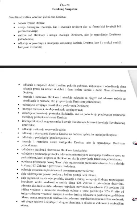 Gre za enega izmed KLJUČNIH ČLENOV statuta družbe GEN-I Beograd. Prav v tem členu se skriva odgovor, da so vse pravne zadeve odobrene s strani matične družbe. Pogodba pa je pravni akt!. (Foto: Prava.si)