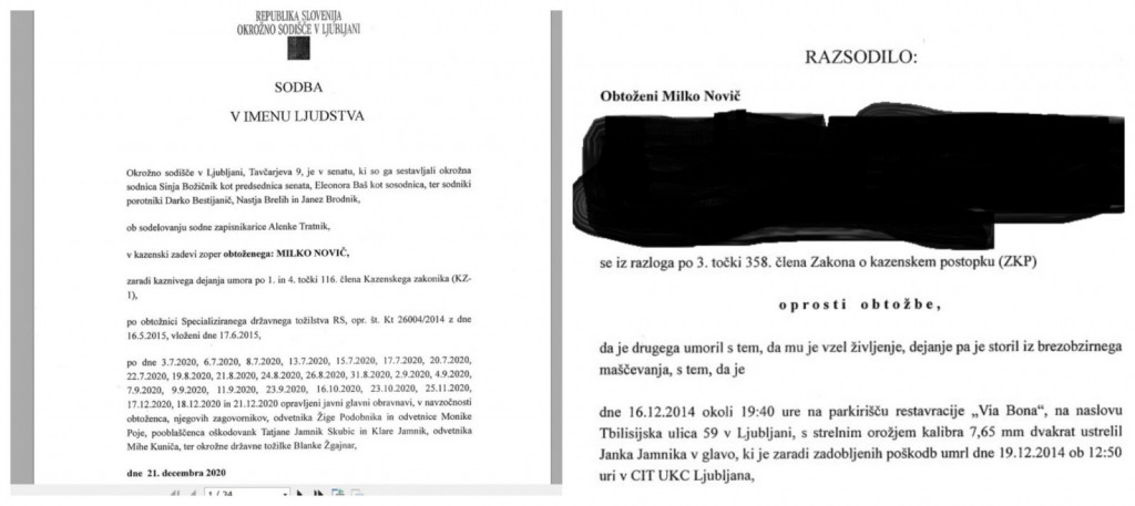 V sodbi, ki sicer še ni zagledala luč sveta, kar je povsem razumljivo za sodne primere, kjer mora globoka država priznati poraz svojega podlega konstrukta, je med drugim zapisano:"Obtoženi Milko Novič … se iz razloga po 3. točki 358. člena Zakona o kazenskem postopku oprosti obtožbe, da je drugega umoril s tem, da mu je vzel življenje, dejanje pa storil iz brezobzirnega maščevanja.”