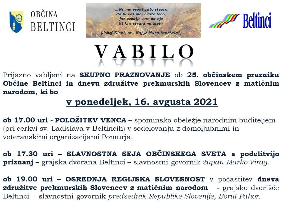 Predsednik vlade Janez Janša se bo v ponedeljek, 16. avgusta 2021, ob 19. uri, udeležil osrednje regijske slovesnosti ob dnevu združitve prekmurskih Slovencev z matičnim narodom. Slovesnost se bo odvijala na dvorišču beltinske graščine, le nekaj korakov daleč od kraja, kjer so pred 102 letom prekmurski Slovenci dočakali zgodovinski trenutek, ko so po skoraj tisočletju postali del slovenskega ozemlja.